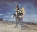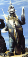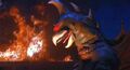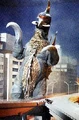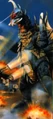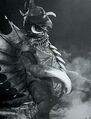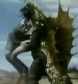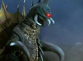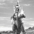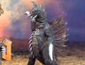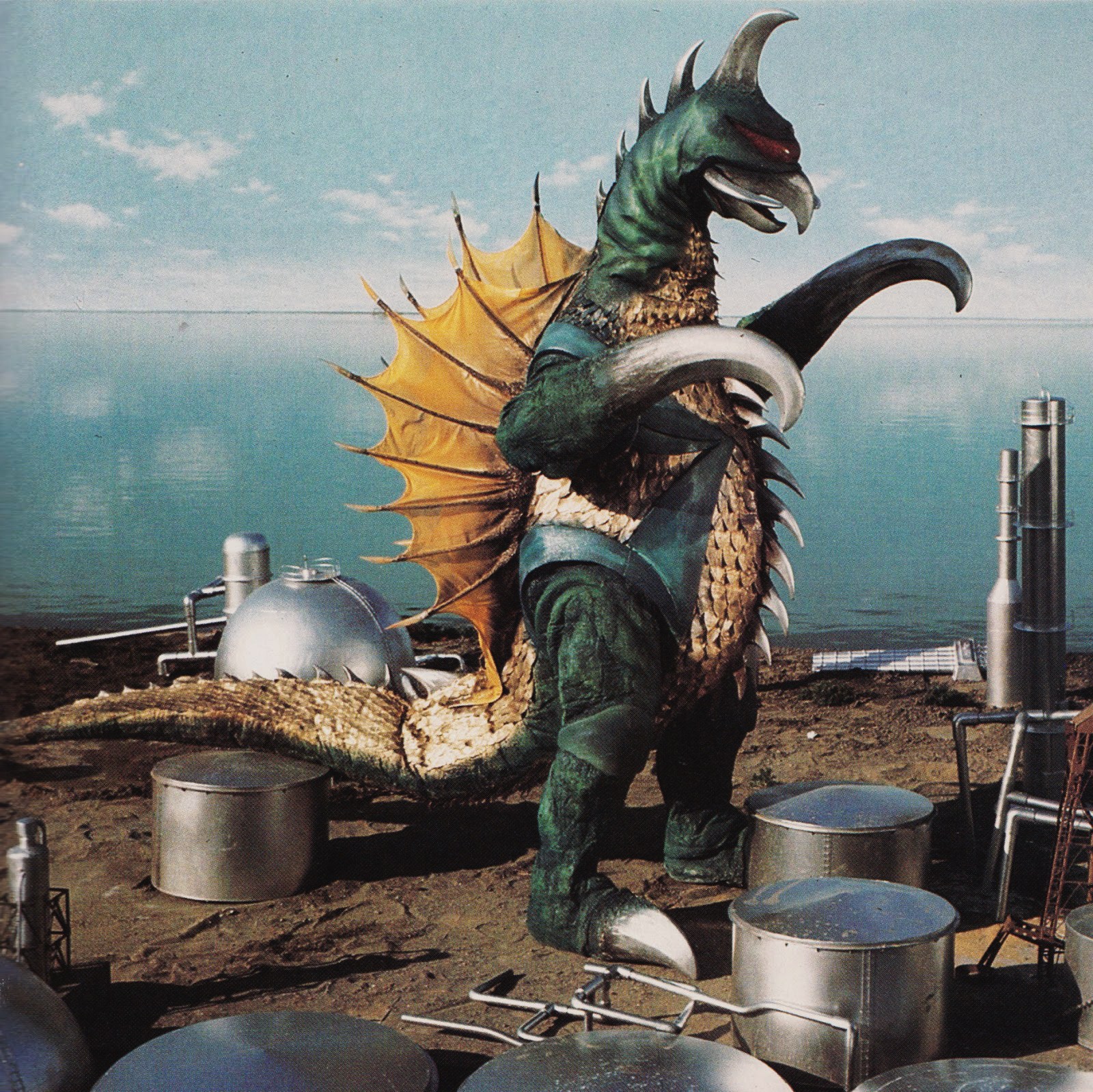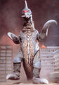 This suit has darkish green skin, with King Ghidorah-like golden scales that cover this suit's body, neck and tail. The suit's fin-like spines are also a golden color, but are smooth and not scaled. In Godzilla vs. Megalon, the suit was made thinner, less bulky, the horn on the head was less pointed, and the buzzsaw didn't move, since it was made of static pieces. This suit also had different sized back fins, a more sad eye visor, scales running up the back/sides of the neck and longer legs compared to the original version. This suit is also called the MegaroGigan.