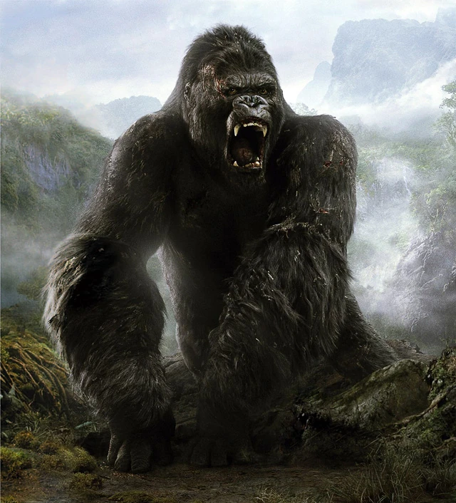 Кинг Конг 2005 года выглядит как огромная горилла с серебристой спиной, заметными шрамами по телу и большими выступающими зубами.