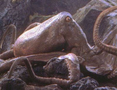 Along with the live animals, two rubber octopus props were built, with the larger one being covered with plastic wrap to simulate mucus. Some stop motion tentacles were also created for the scene where the octopus grabs a native and tosses him.