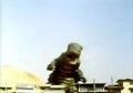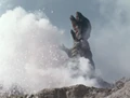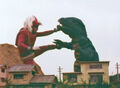 The episode starts with children being menaced by a giant, dinosaurian kaiju named Gorosaurus who is rampaging through a city. They call out for Godman, who immediately appears soaring through the sky. He descends to the ground, already grown and engages the monster. After a short scuffle, Godman attempts to break Gorosaurus's jaw. But, at the last moment, Gorosaurus throws him to the side and they continue to battle. Much later, Godman attempts one more time, but fails once more. Frustrated, Godman summons and throws God-Circles at Gorosaurus, but he dodges all of them. However, Godman is persistent and uses his Super Sonic Wave attack which causes Gorosaurus to explode.