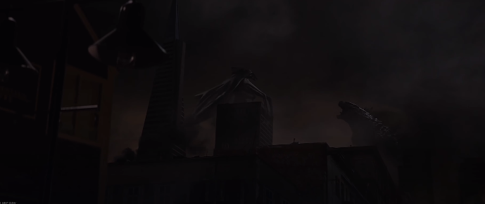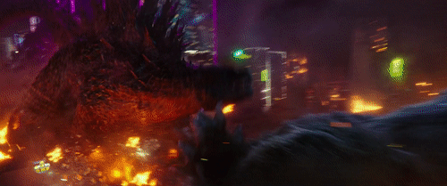 The female MUTO, upon noticing the explosion, stopped pummeling Godzilla to rush towards the nest, while her mate continued to engage Godzilla for a few more moments before realizing what happened and flying off with her. The female roared in anguish and sadness over her dead offspringS but became enraged upon seeing Brody near the nest. Before she could kill him, Godzilla emerged from behind her, and attacked with a sudden blast of his atomic breath, buying time for the human to escape with the other soldiers, who carried the warhead to the docks. The male flew behind Godzilla and pulled him out of the way, allowing the female to recuperate and chase after the soldiers. As the aerial MUTO flew d Godzilla to try and grab him again, Godzilla anticipates his next move and, with a mighty swing of his tail, slammed the MUTO to side of a skyscraper, which impaled and killed him. Godzilla stopped for a moment to catch his breath, only for the skyscraper to collapse onto him and bury him in debris. As Godzilla on the ground being buried in debris, he suddenly caught a glimpse of Brody, who was running to the docks. After briefly staring down at and identifying the tiny ally as the one who saved him from the two MUTOs, Godzilla is consumed by smoke.