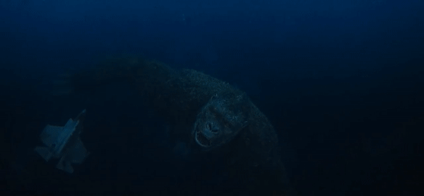 Following Ghidorah's ascension and the Mass Awakening around the world, Mothra emerges from her cocoon underneath the waterfall and flies to Castle Bravo to communicate with Godzilla, who had survived the detonation and is recuperating in a chamber inside an underwater city. Monarch uses the communication frequency to locate him. Mark and a Monarch team board a submarine to revive Godzilla by having him absorb radiation from a nuclear blast, as they realize the natural process could take years. But due to earlier damages the submarine suffered from a Vile Vortex, the weapon system had gone offline. Serizawa volunteers to sacrifice himself to manually detonate the weapon. As the weapon counts down to detonation, Godzilla awakens and stares at Serizawa, who touches Godzilla's snout and bids goodbye to him, who the human calls his old friend. After the detonation, Godzilla emerges from the ocean and fires his atomic breath to the sky before floating menacingly in front of the sub. However, Mark Russell orders the crew to remain perfectly still as Godzilla starts to sniff them. Although not seeing them as a threat at first, Godzilla suddenly realized that the group actually helped by healing him upon catching the scent of Serizawa on them before he swims away without harming them.
