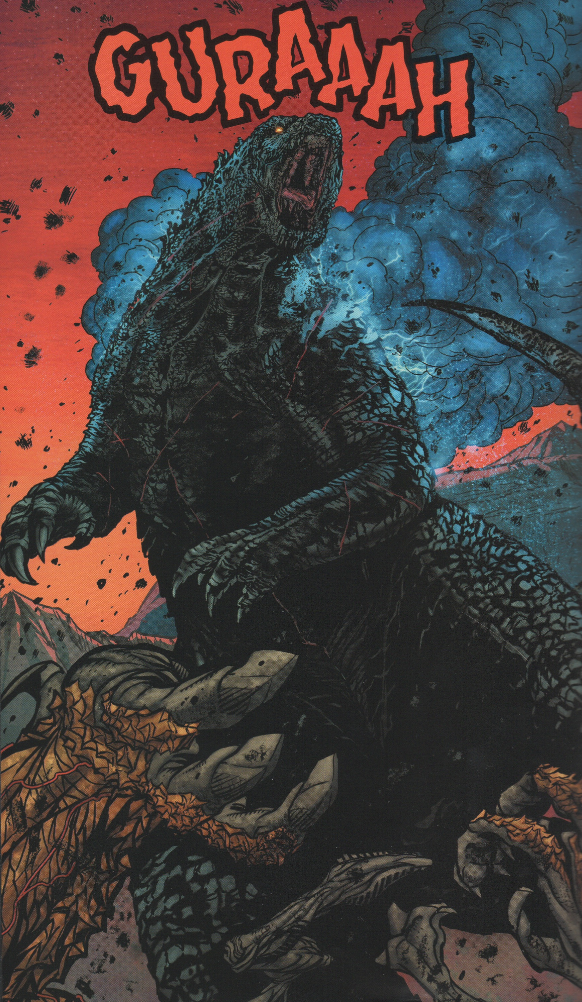In the prequel graphic comic to King of the Monsters, Godzilla's quest in stopping the MUTO threat revealed to be far from over, as the greatest of the Jinshin-Mushis, MUTO Prime, emerged and set out to continue what its fallen progenies started. Godzilla faced the new threat in multiple confrontations starting from an American military base in Guam. The two Titans soon bring their battle to the Barents Sea and later, Athena II Nuclear Power Plant in France at which Godzilla came close to death's door with MUTO Prime nearly infecting him with its eggs. The fight soon ends in a stalemate with both enemies exchanging roars before the latter retreated underground. Godzilla returned to the sea but is visibly injured from the encounter.