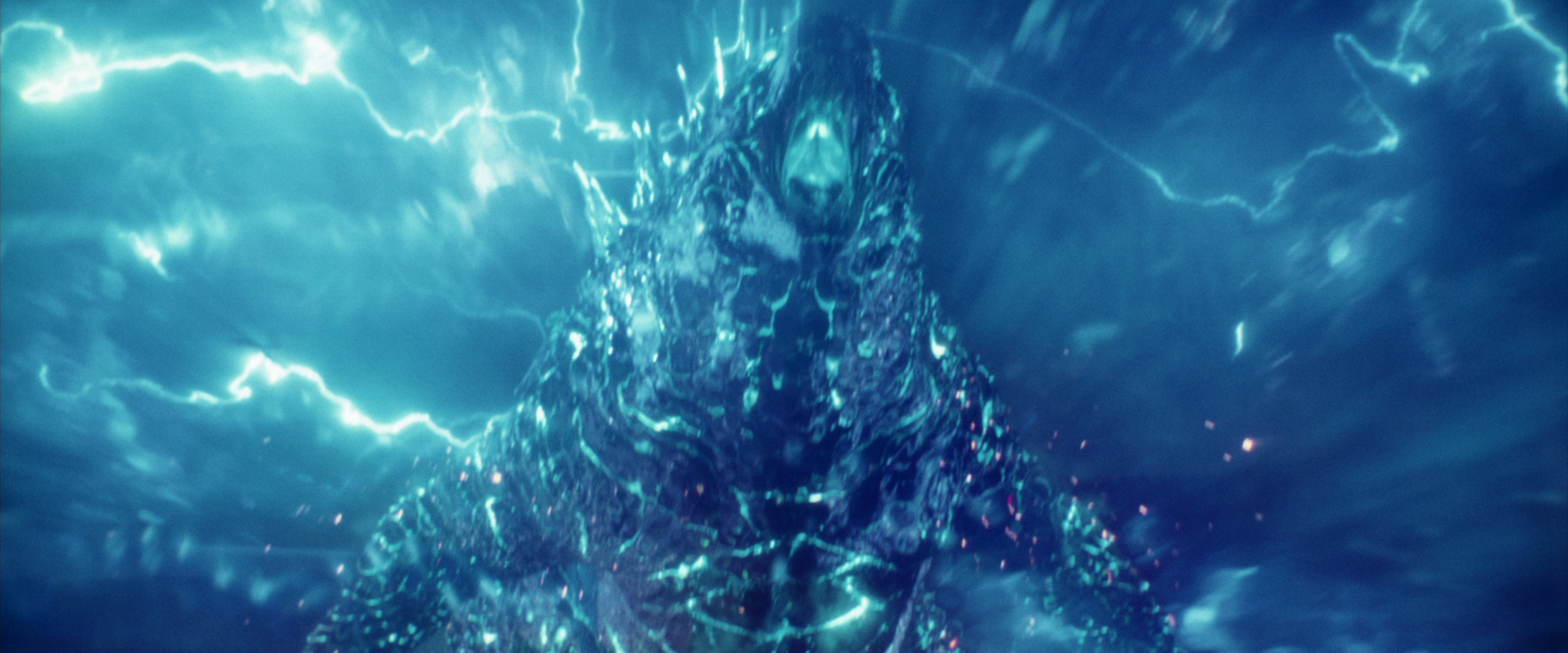 Godzilla emerges from the ocean seconds before the Bikini Atoll bomb detonates.