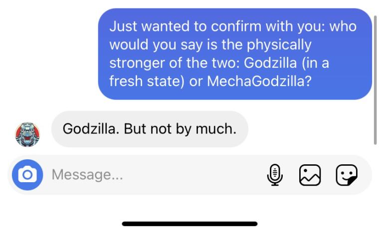 In Godzilla vs. Kong, Godzilla is shown to possess the capacity to become aggressive and violent towards humans and Titans alike if he is provoked, something Madison Russell acknowledged as it was not his nature to attack human settlements without cause or reason. He wreaked havoc upon Apex Cybernetics' facilities upon sensing that its human occupants were hiding what he sensed to be an alpha that was challenging him (the new ORCA was making alpha calls) that Godzilla calls the Hidden One. Godzilla eventually faces "the Hidden One" in the form of the destructive, out-of-control Mechagodzilla — influenced by Ghidorah's consciousness grafted into its systems — and would've continued on a similar destructive path had he and Kong failed to stop it.