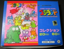 Godzilland consisted of stickers, buttons, coloring books, storybooks, puzzles, short comic strips, trading cards and other items featuring drawings of Godzilland and several kaiju from the Showa series drawn in a chibi style living and playing together. The activities the kaiju are shown doing range from playing sports, to shopping for groceries, trying on clothes, dancing, and frequently eating rice cakes. Some of the merchandise depicts the kaiju in various colors, Godzilla himself is seen in green, yellow and even pink, and at times shows multiple of the same kaiju at once. Interestingly, Hedorah is depicted as female and is one of Godzilla's friends rather than among his enemies, which in the line include Mechagodzilla, Gigan and Gigan. Mothra's larvae are also shown to be brother and sister, as one larva is generally shown to be red and wear a hat, while the other is usually pink and has pronounced eyelashes and a bow on her head. Every piece of merchandise in this line includes a logo which reads "COMIC SAURS STORY GODZILLAND THERE IS THE MONSTERS PARADISE."