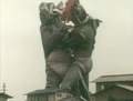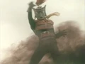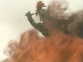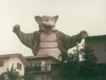 Tonchiki, eager to impress his master, briefs Maoh on his latest scheme which this time requires the aid of Foksaurus. Maoh approves of the plan despite Tonchiki's record of failures. Not too far away, a young boy is seen trying to fish a doll out of a small body of water with a stick. But, he accidentally knocks the precious plaything farther into the water, bringing tears to the eyes of its owner, presumably his sister. Though, there is no time for weeping as proven by the doll's spontaneous combustion and the appearance of Foksaurus! The children dash away as Foksaurus trudges closer and manage to signal Greenman. Arriving in the nick of time, Greenman safely escorts the terrified youths as he attacks the foe in a blinding frenzy of punches. Beating the devilish fiend to the ground, Greenman's success nears ever closer. The hero shows no signs of easing, further infuriating Maoh. But the battle is not over yet; Foksaurus disappears into a fountain of smoke, and reveals his gargantuan form. Stunned, Greenman calls forth his electronics to alter his size as well. The giants of good and evil converge in a small town, determined to destroy one another. However, Greenman does not forget his morals, putting the battle on pause to throw an Ear Boomerang at the tormentful Tonchiki. Losing interest in the children he was chasing, the devious hellspawn orders Foksaurus with his universal command "Chi Chi Pui Pui No Pa!" It soon becomes apparent what exactly this instruction consists of, as Foksaurus begins to emit a yellowish breath. Greenman attempts to combat the substance with another Ear Boomerang, however it is instantly destroyed, causing a powerful explosion which ignites the lingering toxin. In a horrible turn of events, part of the city is engulfed in flames and acts as a fiery imprisonment for Greenman. And to make matters worse, Foksaurus deliberately adds more fuel to the fire, generating even more unbreathable smoke. The perilled savior, gives it his last effort to retaliate, firing off a single Leg Arrow which barely even reaches its target. But just when it seems all hope has been lost, Greenman confidently stands and puts out the surrounding fire with the Fire Fighting technique before dropping to his knees, drained of power. Albeit, he proudly rises once more after much provoking, and fires a successful Leg Arrow before charging forth in combat. Strategic maneuvering and strong blows drive Foksaurus to dart away with fright. With Greenman close behind, Foksaurus gives it everything he's got, pushing out the last of his flammable breath while Greenman simultaneously fires Breaster missiles concluding the dramatic confrontation with a bang.