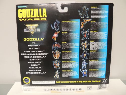 The second main line of Trendmasters' Classic Godzilla series released in 1995. Many of the KOTM figures were repackaged under the Godzilla Wars box, but there were also new figures made as to not seem stale. Like before, many of the packaging had variations to them, as well as the figures themselves, and new collectible trading cards were available with most of the toys.